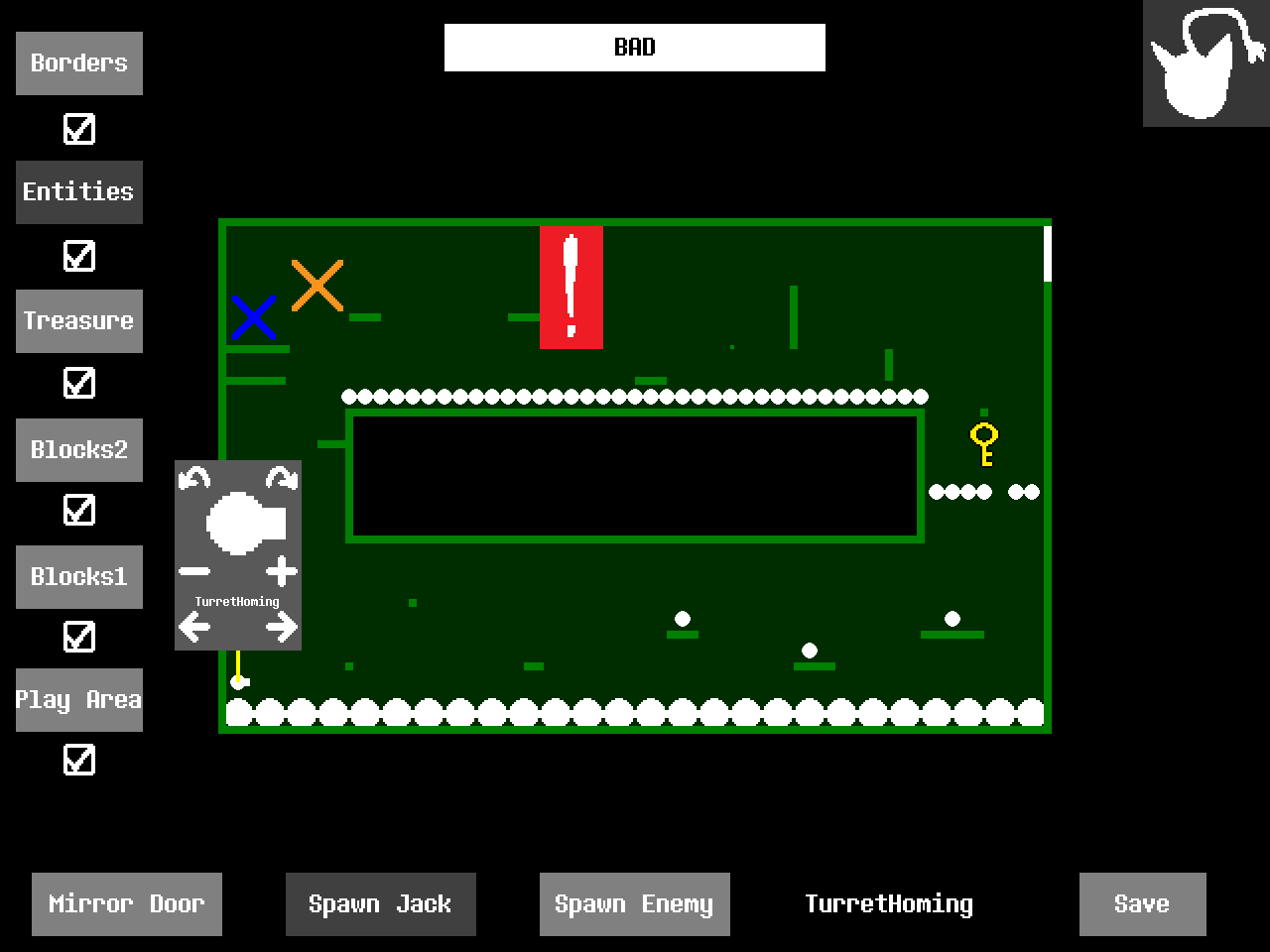 - - Entities is used for placing any object with unique behavior. That includes the player spawn point, the key, the door, enemies and Jack's pumpkin